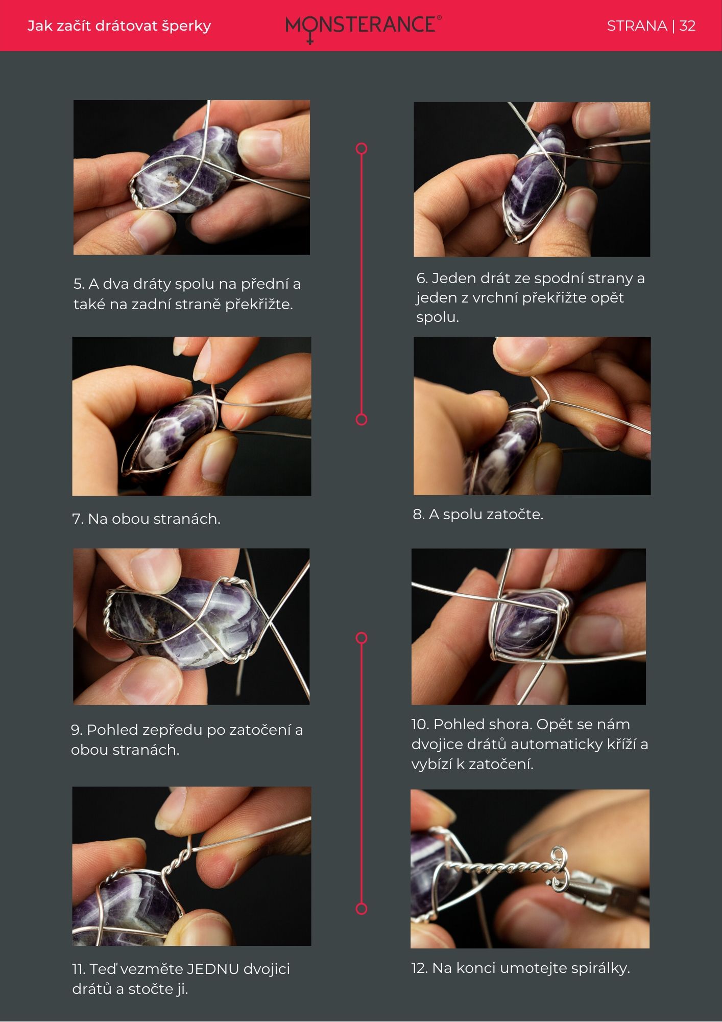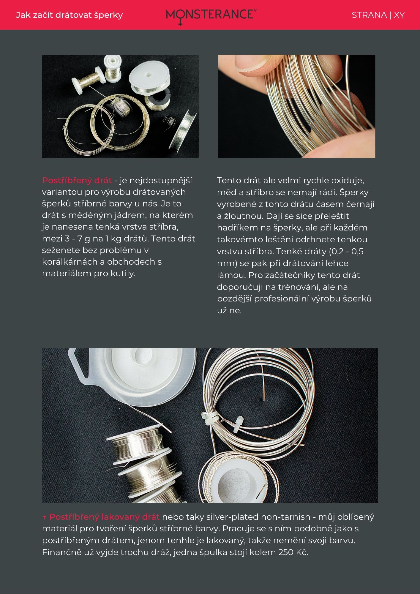 V prvních 3 kapitolách e-booku se seznámíte se všemi druhy drátů používaných v drátenictví a zjistíte, jak ten správný pro svůj šperk vybrat. Nechybí popis kleští a druhů kamenů s praktickými ukázkami využití. Jako bonus objevíte na konci knihy ještě seznam oblíbených prodejen “mých” dráteníků, takže si materiál můžete hned objednat. Schválně tohle uvádím jenom jako bonus, nechci najíždět do placených spoluprací.