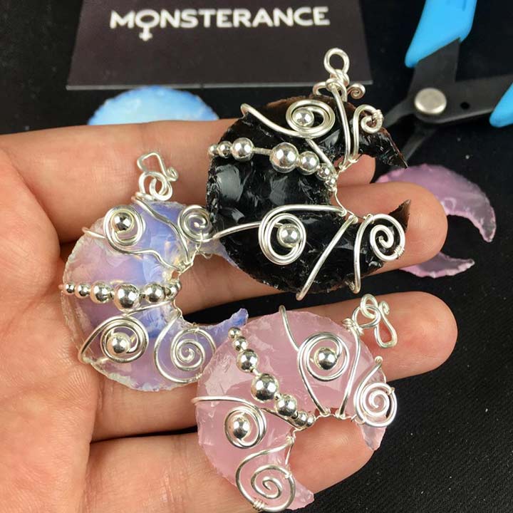 Přívěsek z opalitového měsíce upevněný pomocí technikou wire-wrappingu.