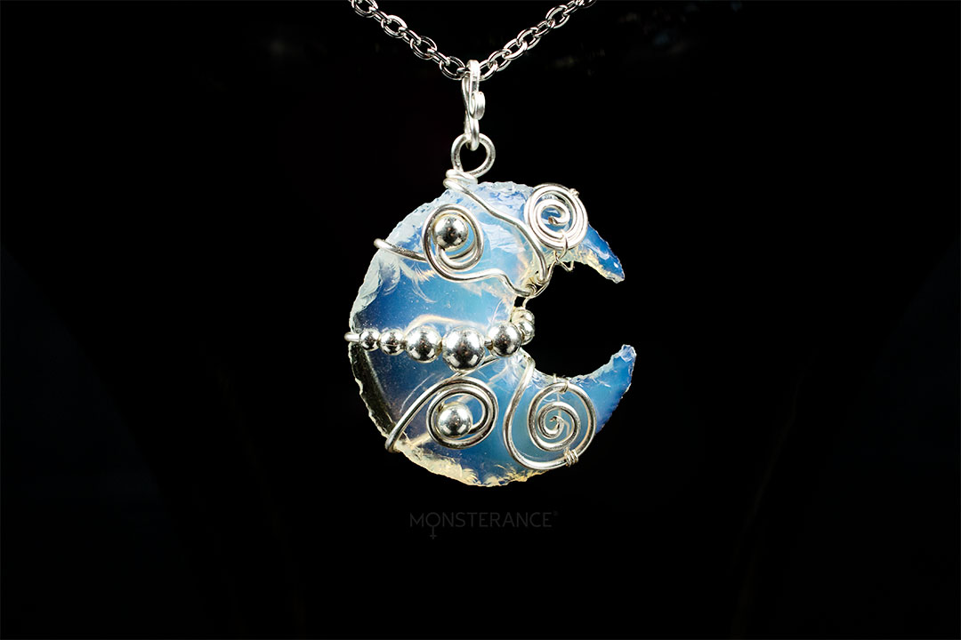 Kouzelný, magický a krásně fluoreskující. Opality mění svoji barvu podle dopadu světla a podle pozadí, na kterém leží. Od světle modré po tóny žluté, fialové a mléčné. Přívěsek z opalitového měsíce upevněný pomocí technikou wire-wrappingu.