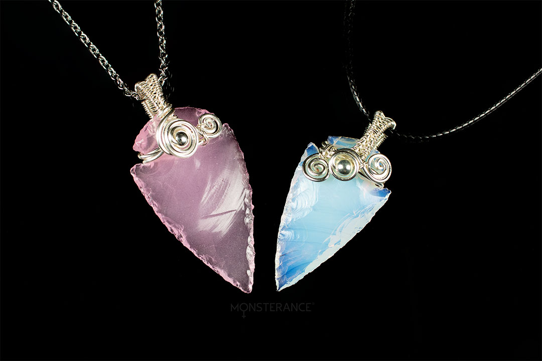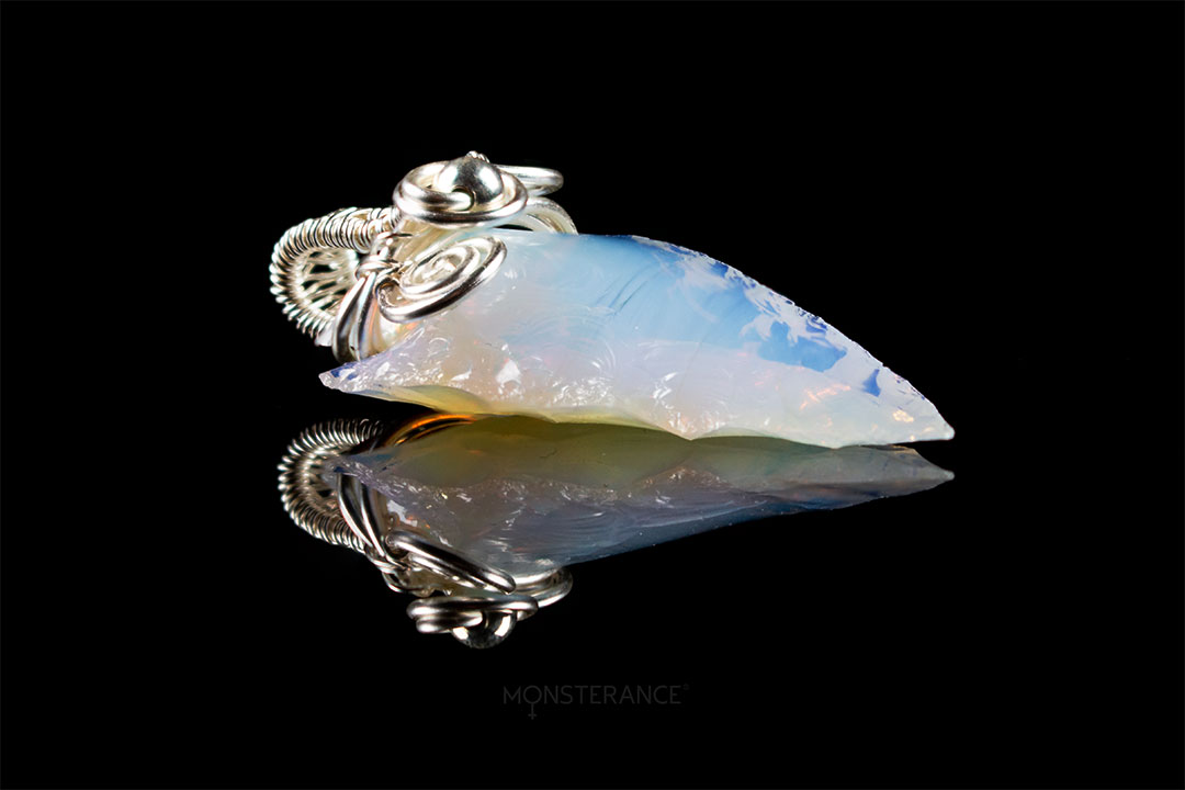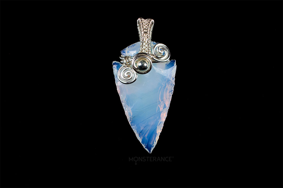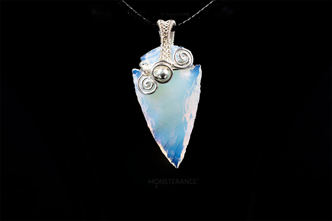 Přívěsek z opalitového šípu upevněný pomocí technikou wire-wrappingu.